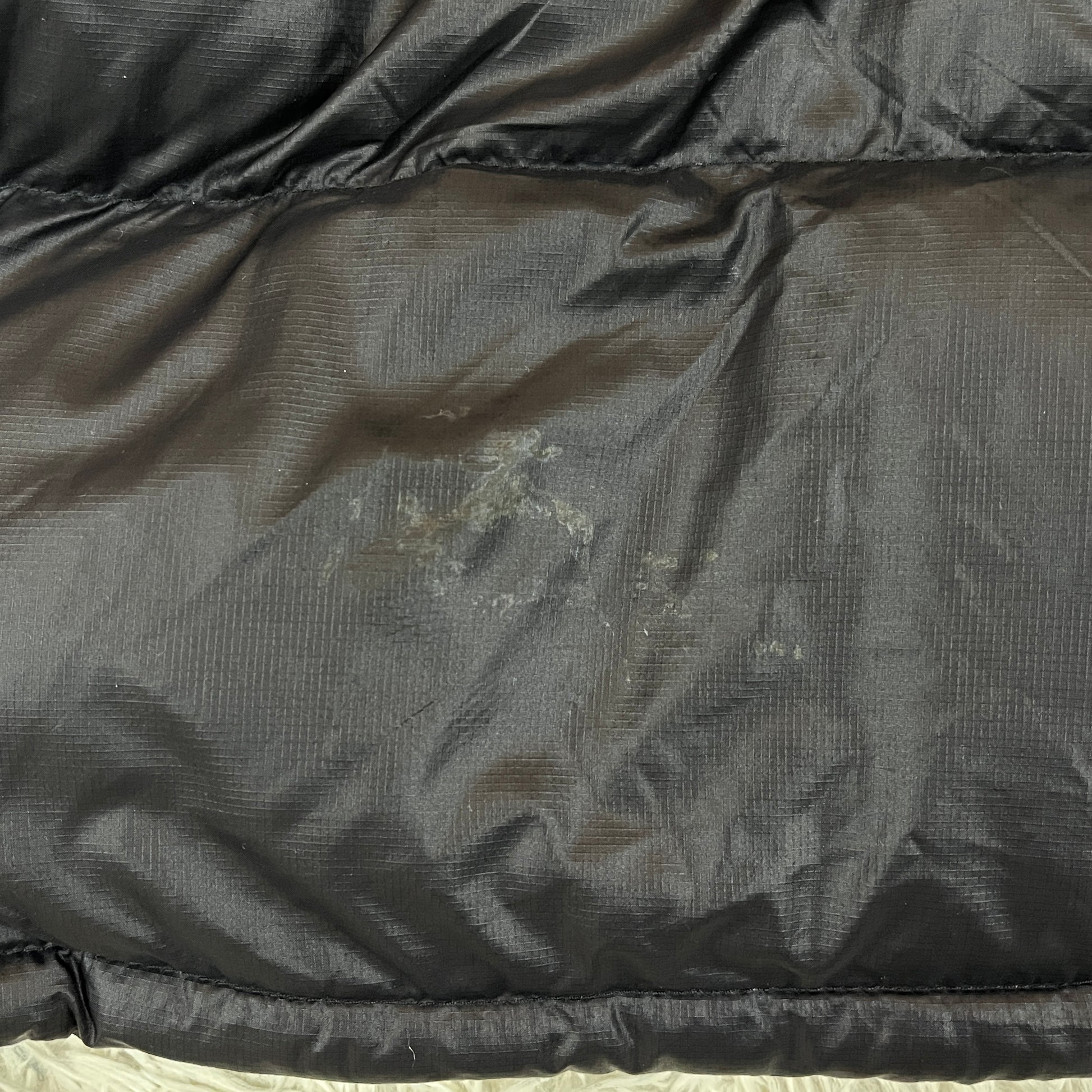 コンディション: 背面左裾付近に汚れがございます(画像参照)。その他、多少の使用感はございますが、ダウンのボリュームはしっかりしており、まだまだ長くご愛用いただけます。