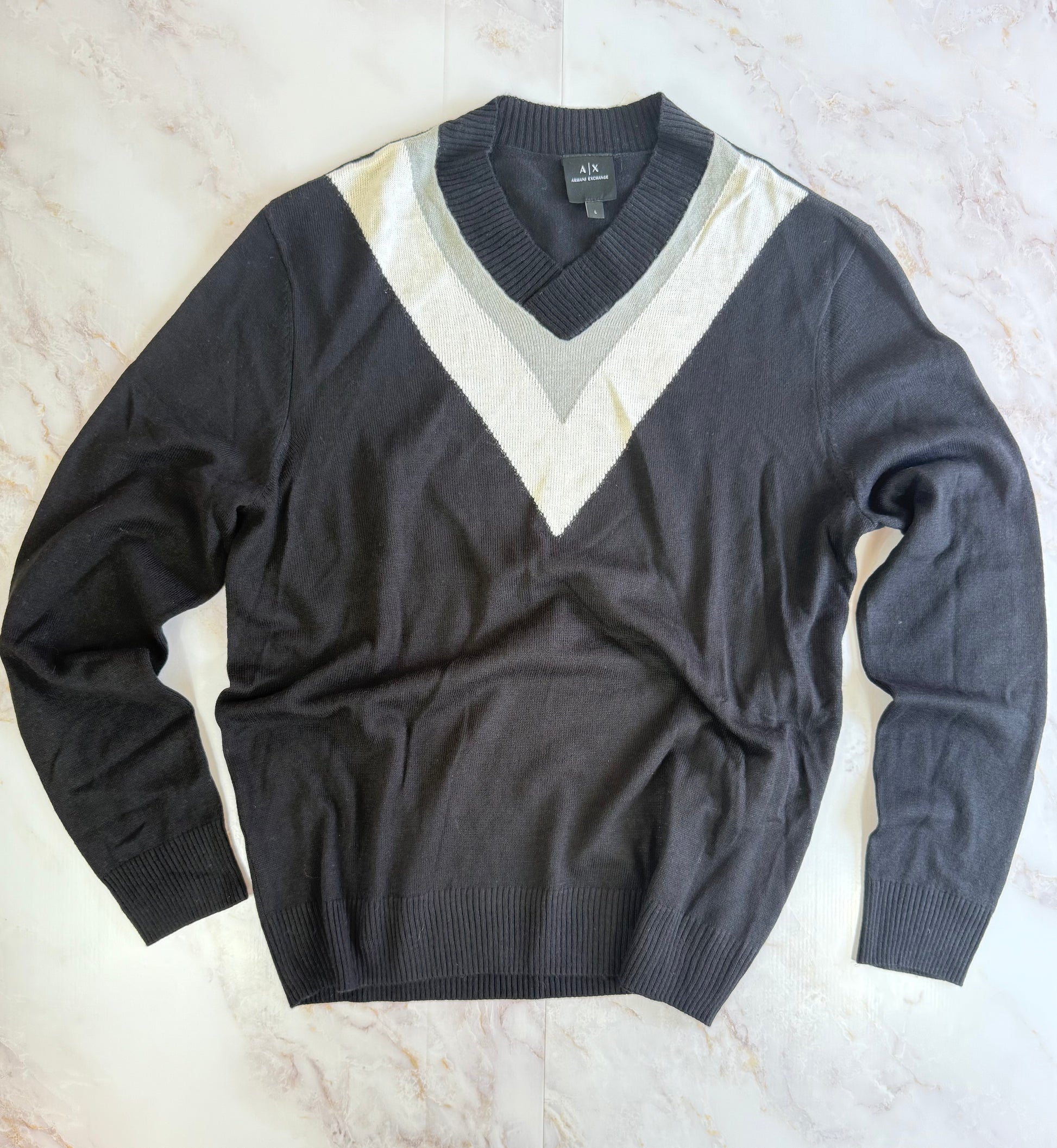 【ARMANI EXCHANGE】アクション Vネック セーター メンズL ブラック×ホワイトライン クラシックニット イタリアブランド 正規品