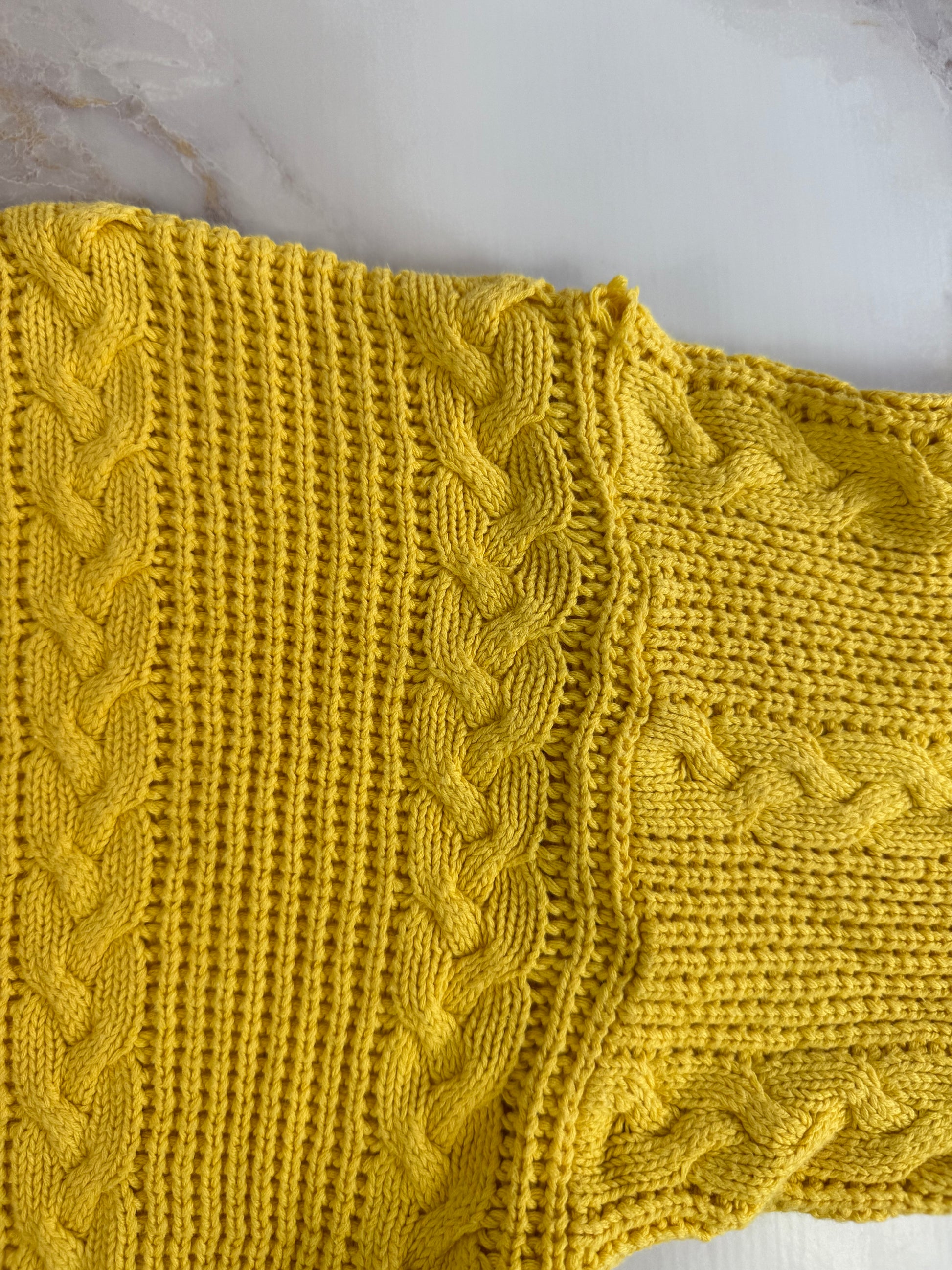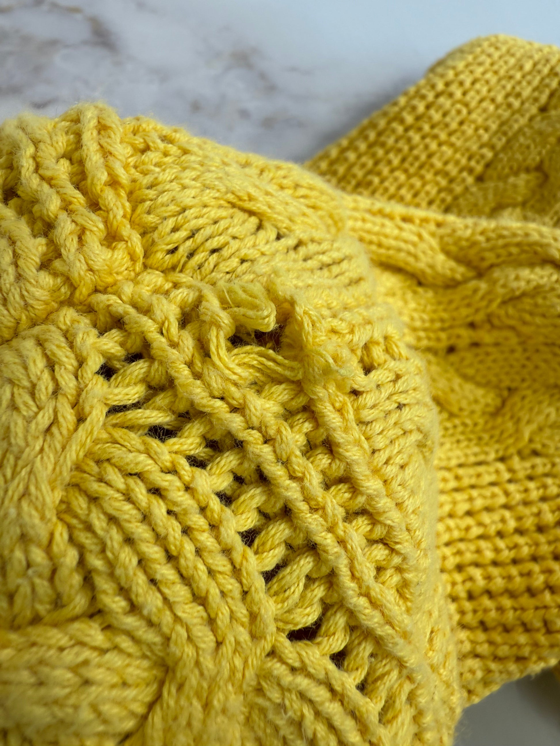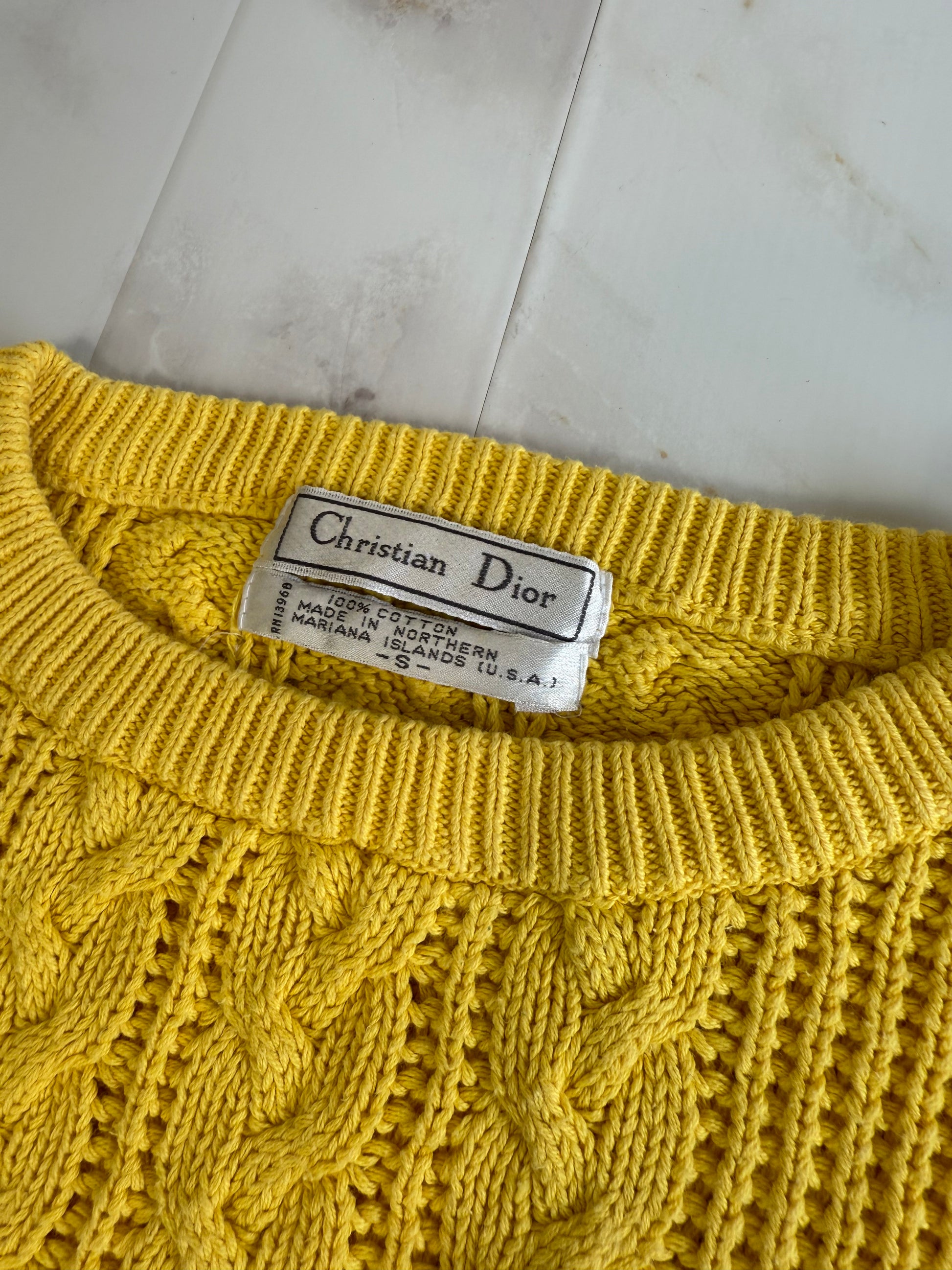 鮮やかなイエローカラーが目を惹く、Christian Diorのヴィンテージケーブルニット。立体感のある編み模様とコットン素材が特徴で、秋冬はもちろん春先にも映える万能アイテムです。
