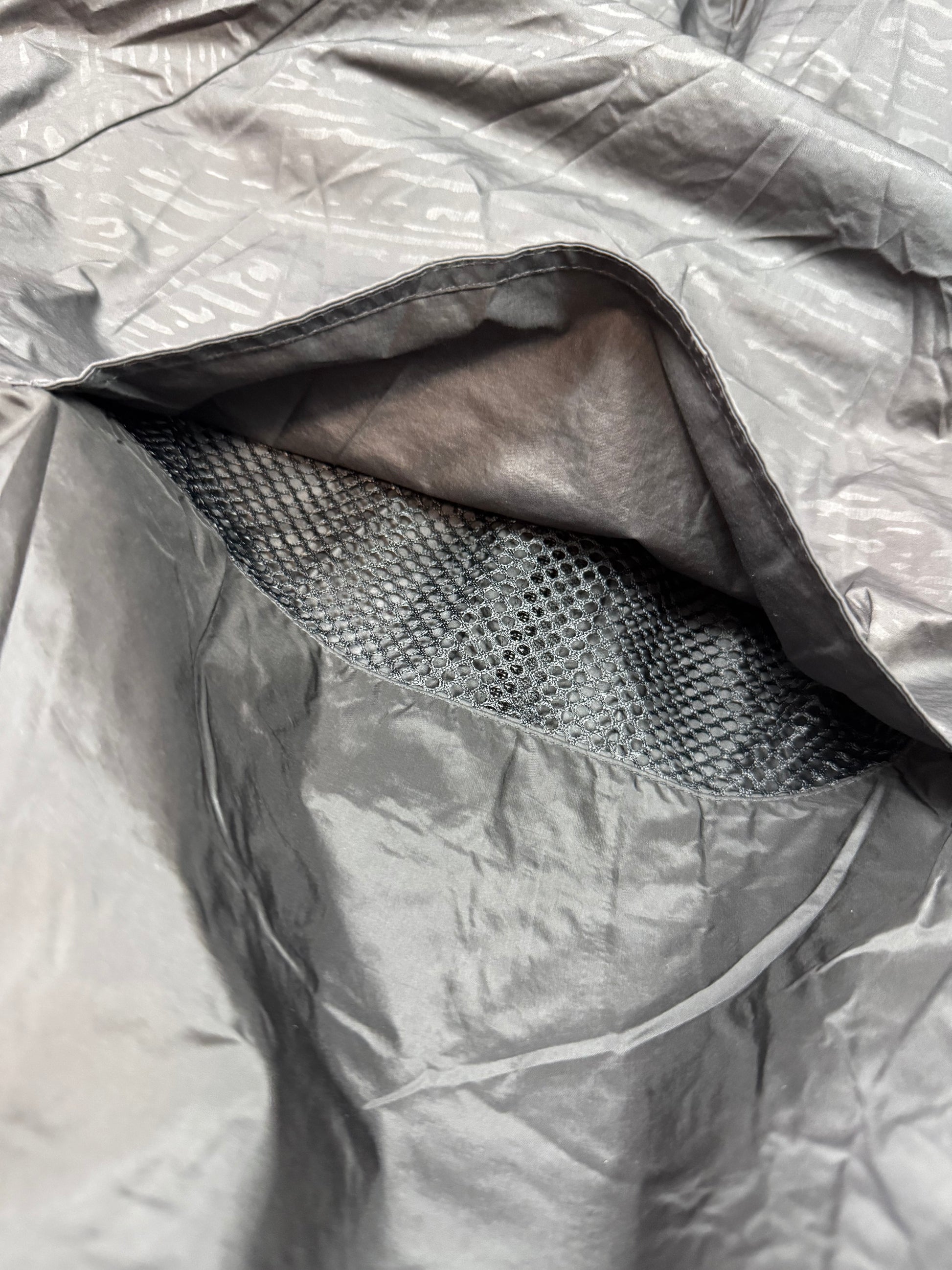 胸元のホワイトロゴとフード付きデザインで、シンプルながら洗練された印象に。内側はメッシュ仕様で快適な着心地です。
