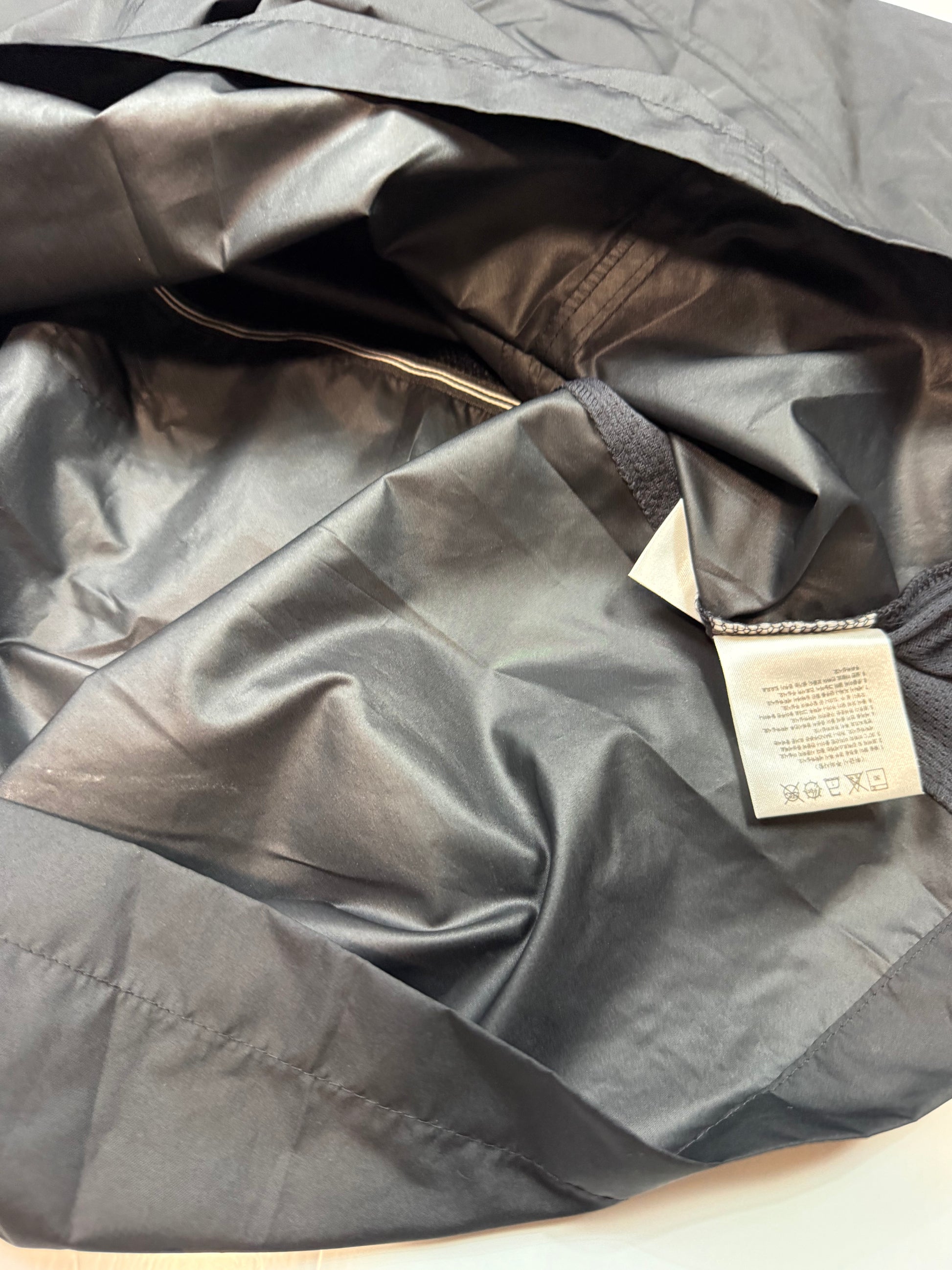 ブラックを基調としたナイロン素材で、軽量かつ動きやすい仕上がり。胸元のスウッシュロゴがアクセントになっています。