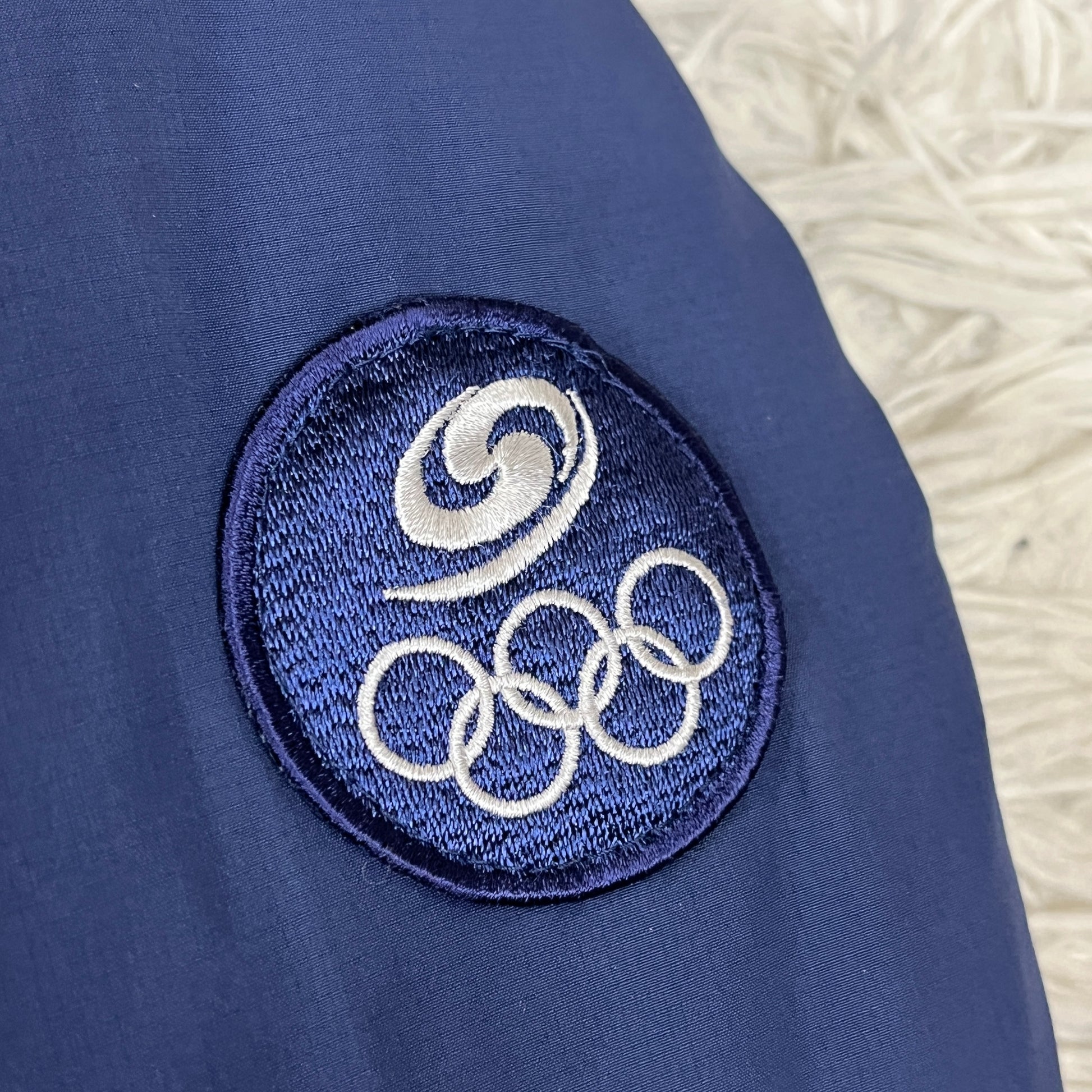 袖に刺繍されたオリンピックロゴが印象的で、スポーティーさと特別感を演出。