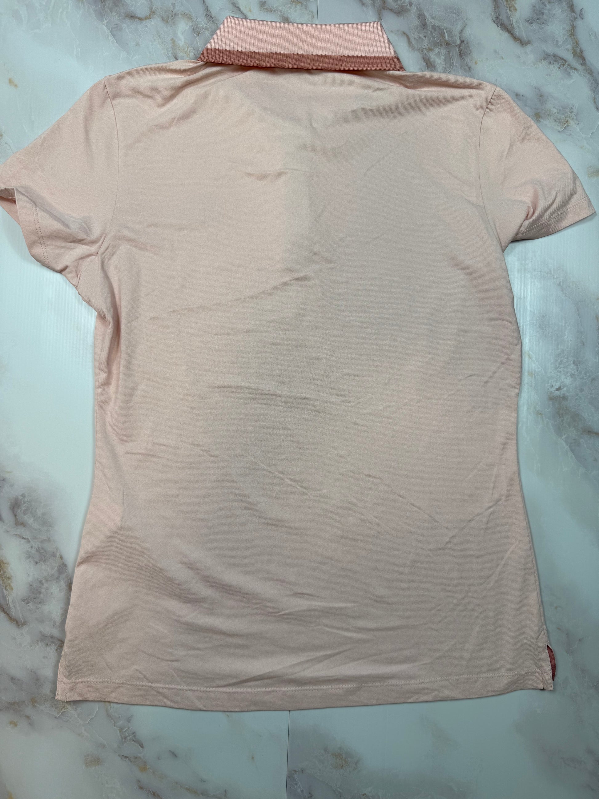 淡いピンクに襟とロゴ刺繍の落ち着いたトーンが映えるデザインで、カジュアルからアウトドアまで幅広く着回せる一枚。