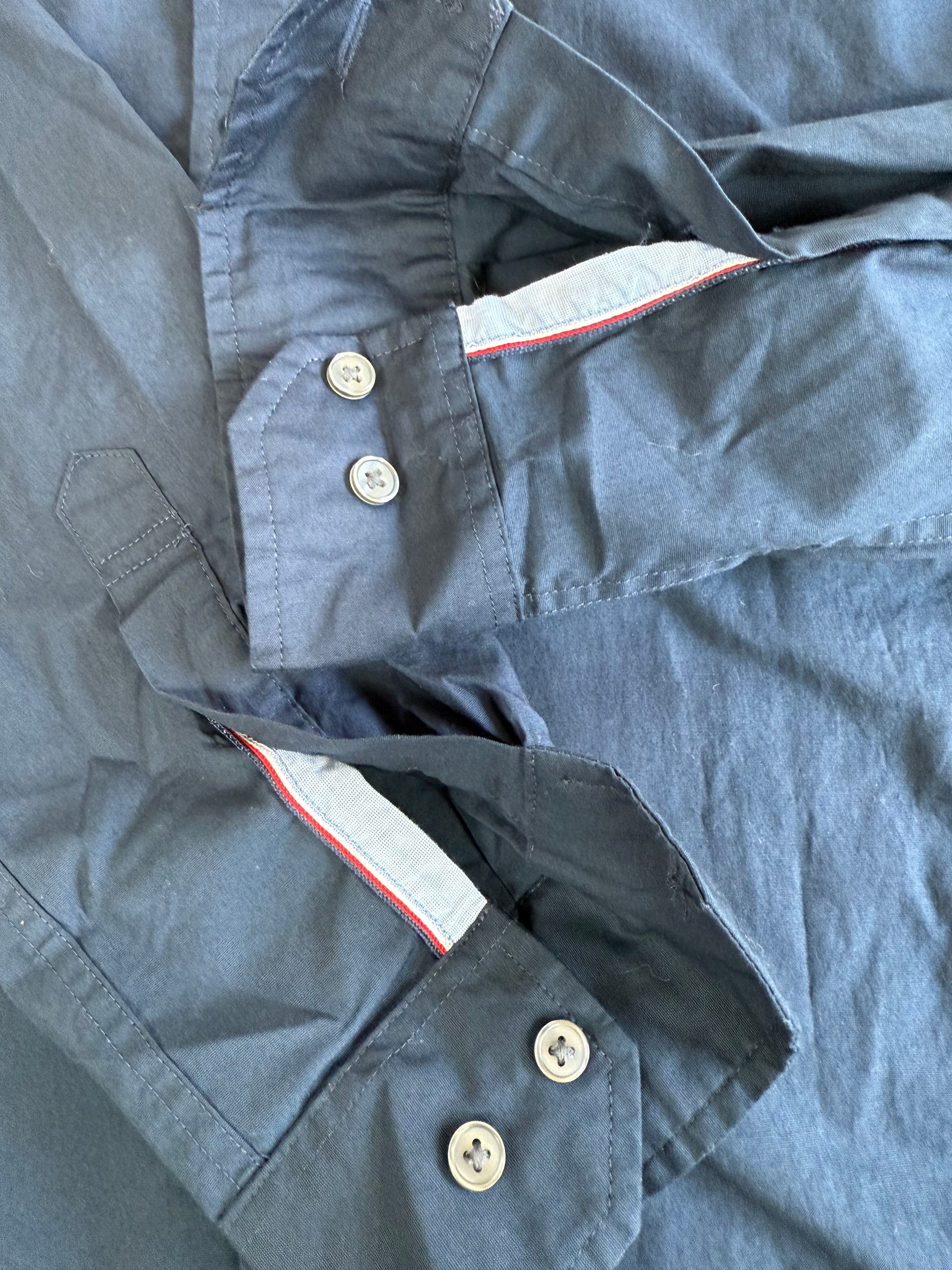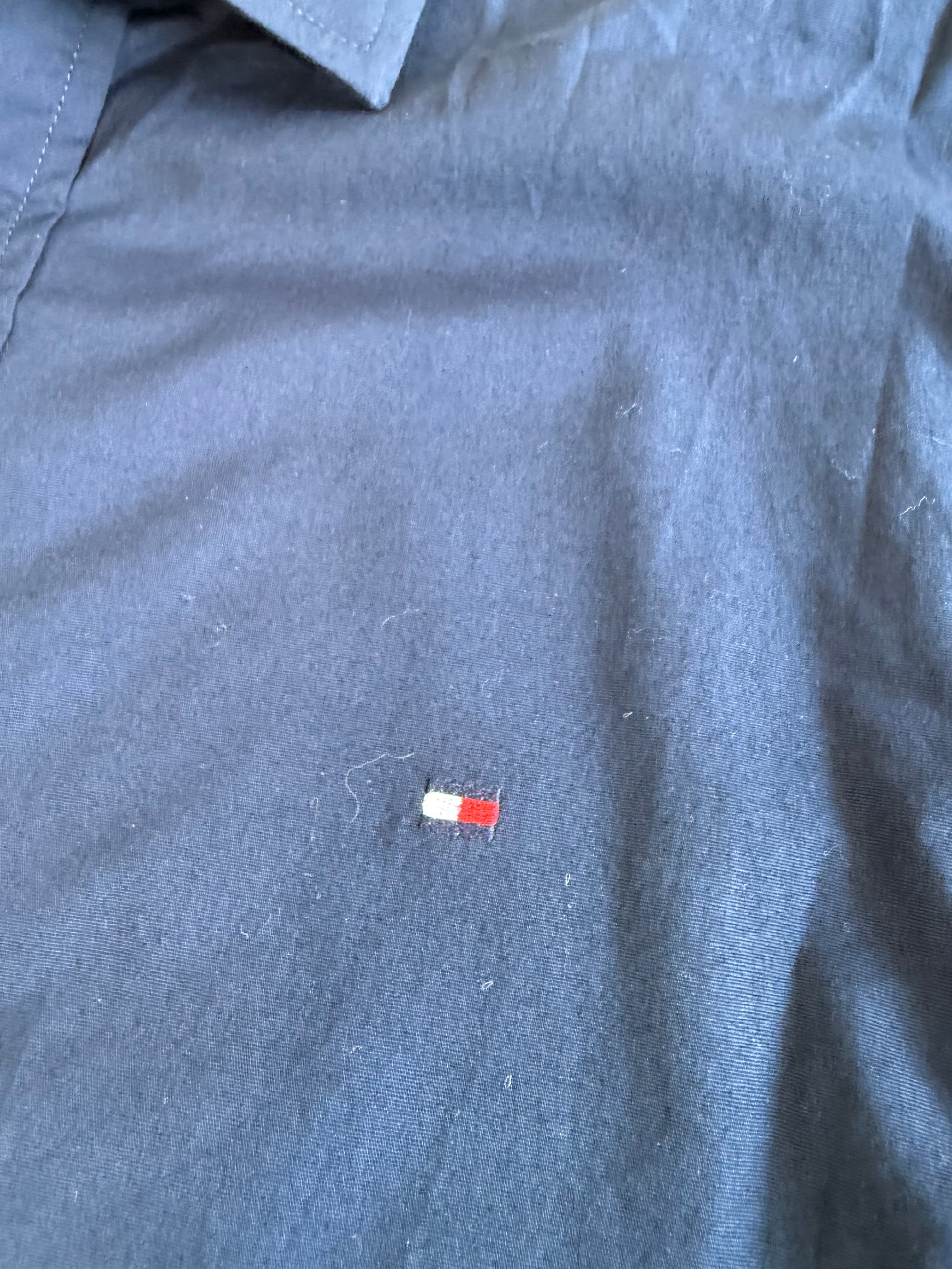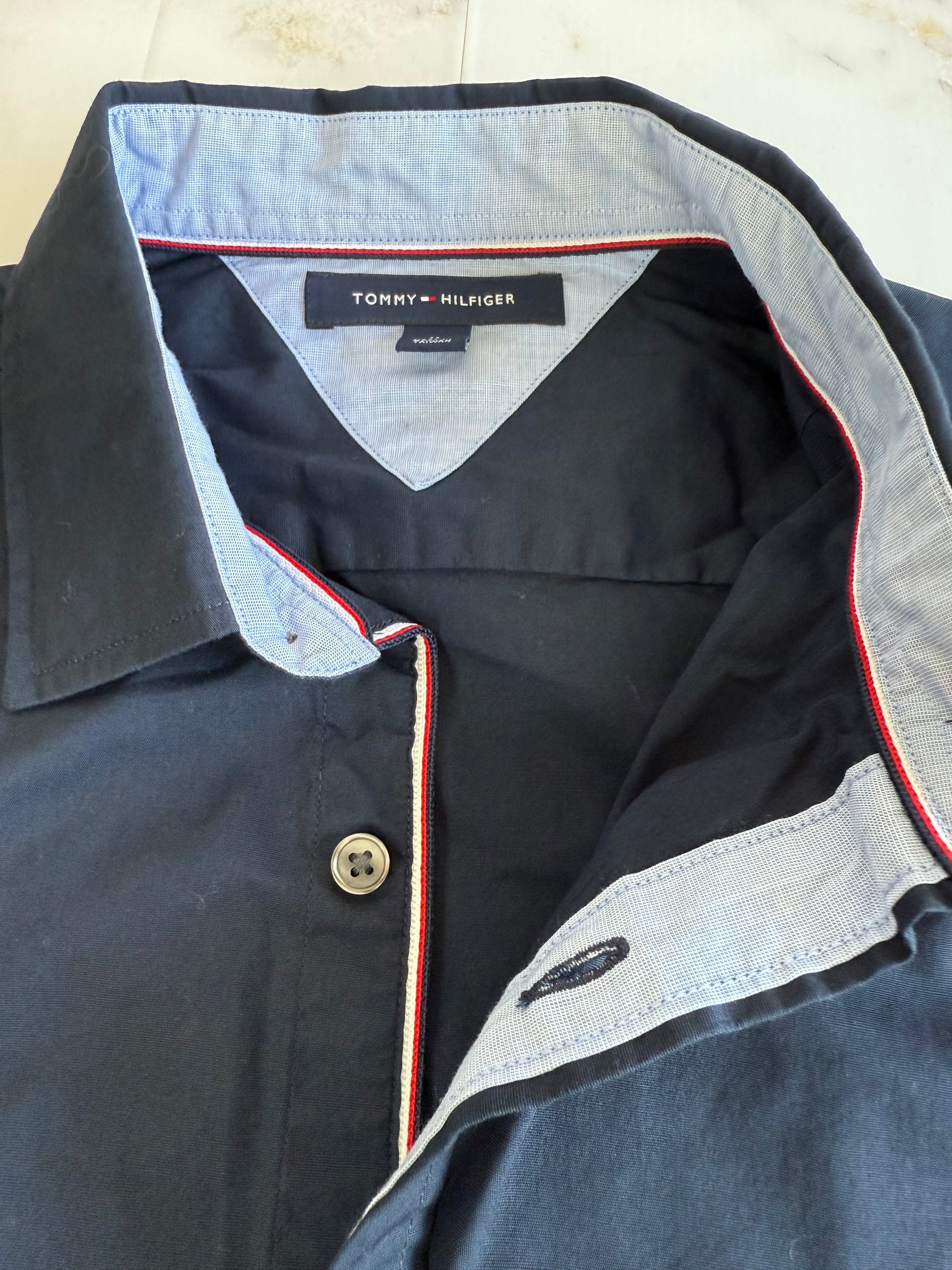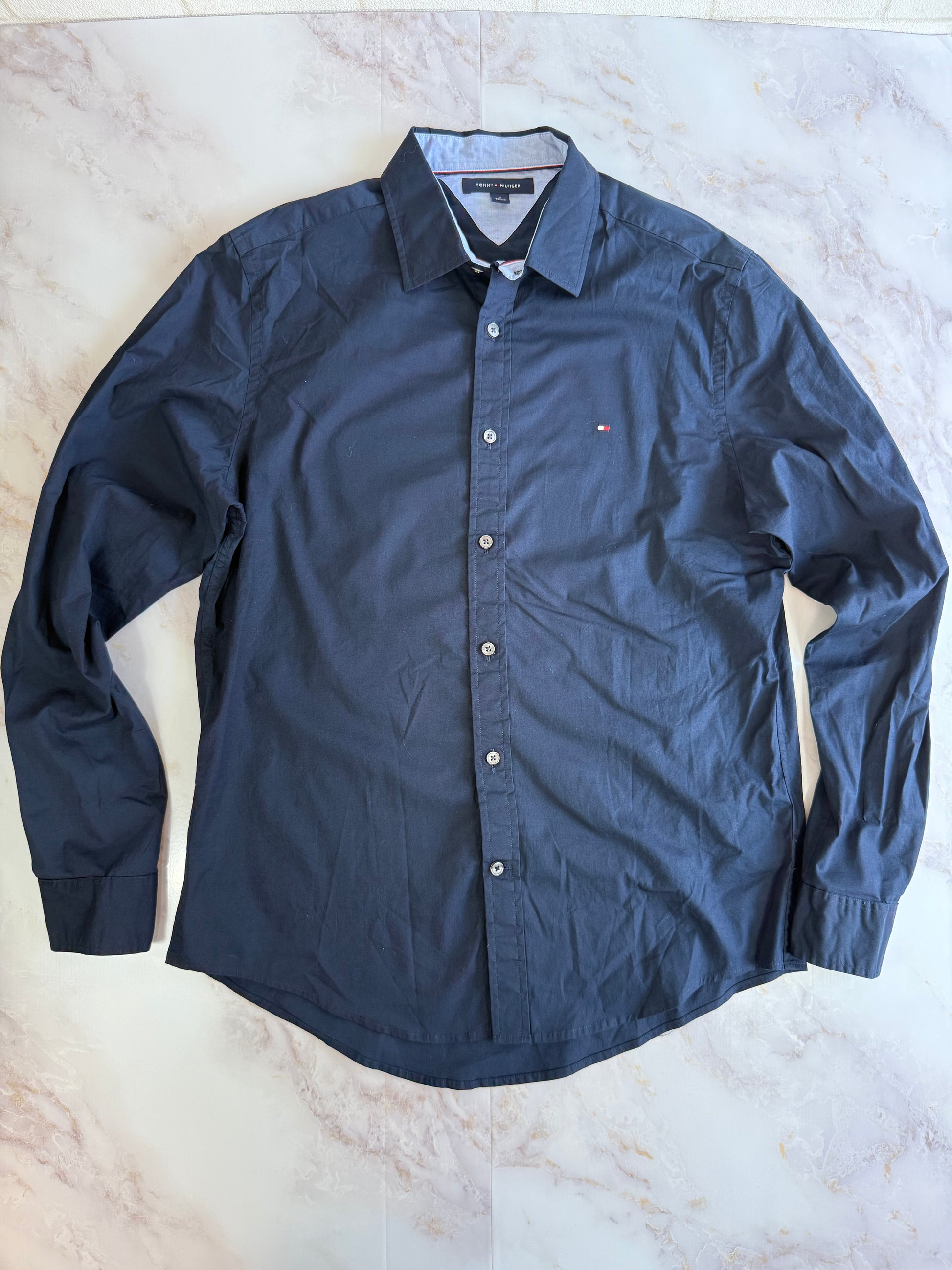 TOMMY HILFIGER(トミーヒルフィガー)の長袖シャツです。シンプルな無地ネイビーに胸元のブランド刺繍がワンポイント。カジュアルからビジネスまで幅広く着回せる一枚です。