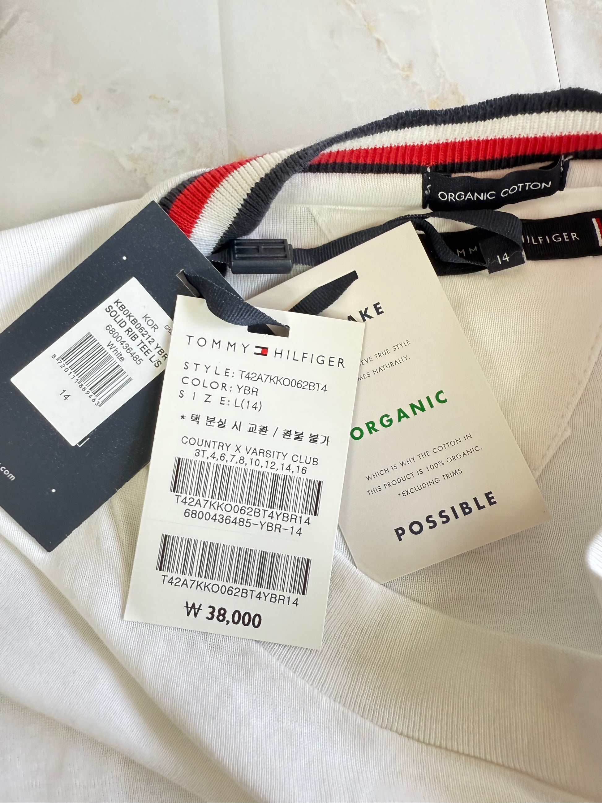 【TOMMY HILFIGER】トミー ヒルフィガー オーガニックコットン 長袖Tシャツ 164(L相当)ホワイト クルーネック 刺繍フラッグロゴ